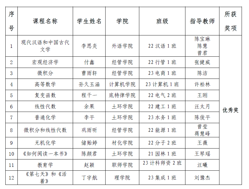 根据文件要求,我校开展了2023-2024学年最美笔记评选活动。经学生申报,学院推荐,学生投票及教务处、团委组织专家组成评选委员会评审,最终评选出最美笔记22份(其中一等奖2名,二等奖3名,三等奖5名,优秀奖12名),优秀组织单位2个,获得一、二、三等奖的指导教师作为优秀指导教师。获奖名单公示如下: